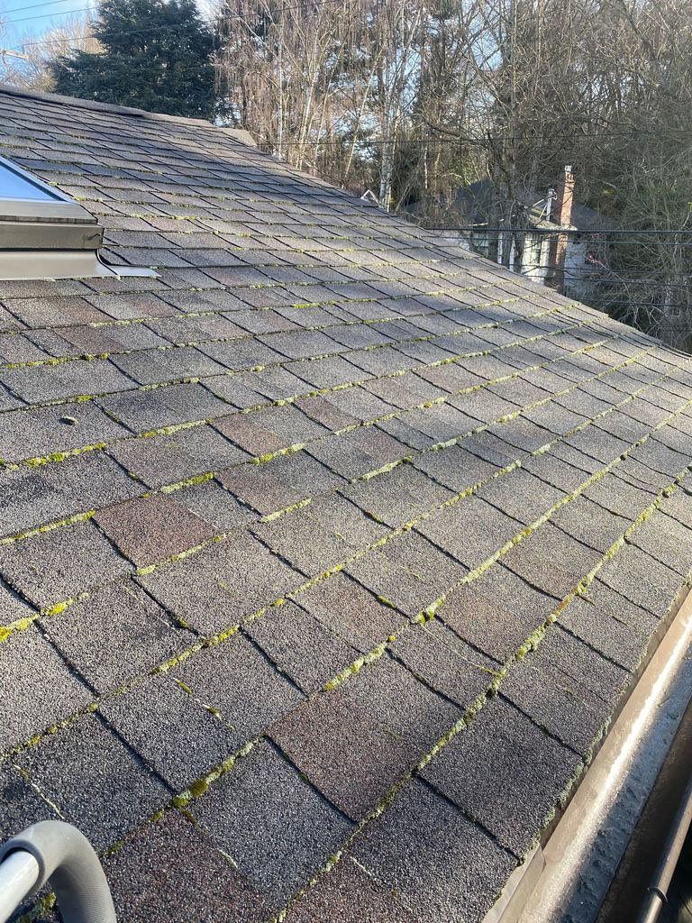 Unless discussed in advance, we will utilize your yard waste bin to dispose of moss, leaves, and other natural detritus from the roof and gutters. If there is not adequate room in your yard waste bin, we will leave a compostable garden bag by your bins for pick-up by the city. Moss treatment will be visible on the roof for a few weeks. This is completely normal and will not damage or discolor the roof.